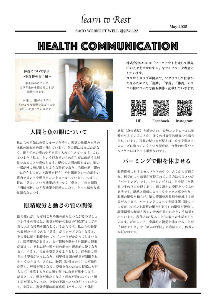 眼筋の緊張を和らげることは、脳の情報処理負担を軽減する効果があります。現代人は“見ること”に偏った生活をしています。だからこそ、意識的に視覚を休ませることが 「動きやすさ」や「痛みの予防」に直結する、休養の本質なのです。