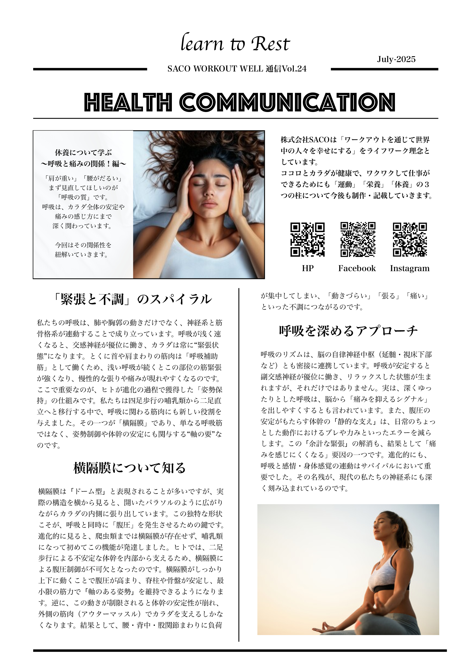 私たちの呼吸は、肺や胸郭の動きだけでなく、神経系と筋骨格系が連動することで成り立っています。呼吸が浅く速 くなると、交感神経が優位に働き、カラダは常に“緊張状態”になります。とくに首や肩まわりの筋肉は「呼吸補助 筋」として働くため、浅い呼吸が続くとこの部位の筋緊張が強くなり、慢性的な張りや痛みが現れやすくなるのです。