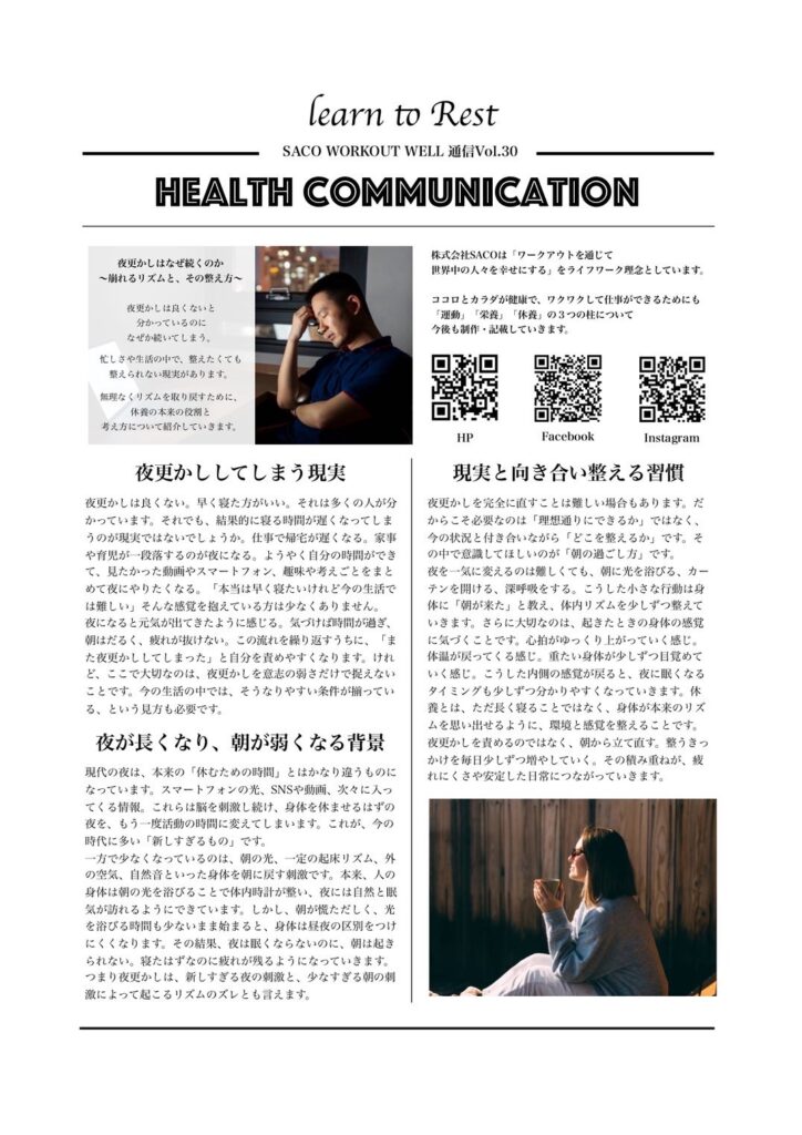 休養について学ぶことは、単に長く寝ることではなく、カラダ本来のリズムを取り戻すことにつながります。夜更かしは意思の弱さではなく、環境や習慣によってつくられるものです。日々の疲れを整える鍵は「無理に変えること」ではなく「整えていくこと」にあります。