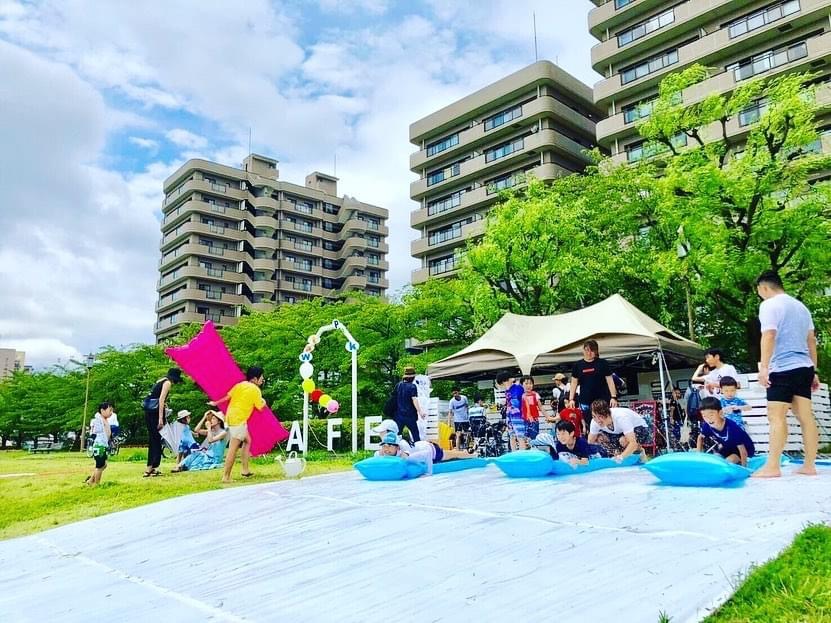 信濃川の河川敷に巨大ウォータースライダーやトランポリン、